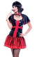 Sleeveless dress with large red cross on the front. The dress is supported by black shoulder straps. Attached red skirt with black netting overlay The back is non shiny and has red lace ties. The back is not exposed as the ties go over the dress. Separate black cape with high standing collar. The collar is supported by an inner wire frame which keeps it standing upright The cap has red trim and a red neck section with an attached black pearl necklace You can wear this dress either with the cape on or off