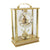 Details: A rectangular metal and glass mantel clock with gilt finish, skeleton movement and light catching spinning balls. Approximate size 14.5 x 20 x 7.5cm, requires one AA battery and one AAA battery. Constructed from metal and glass with an acrylic rear panel allowing access to the clock movement.